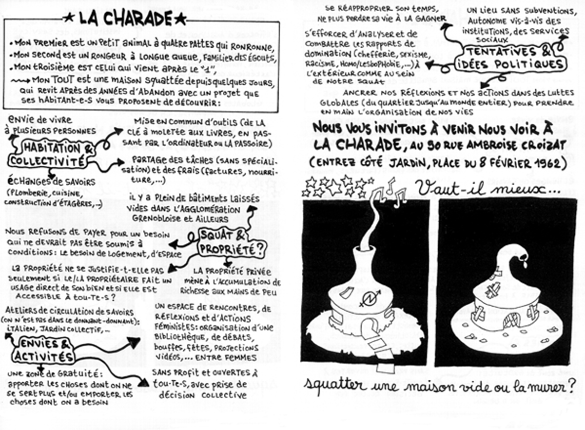 Avec comme projets l'habitation collective d'une dizaine de personnes, la mise en question de la propriété privée, diverses activités ouvertes au quartier (ateliers de circulation de savoirs, jardin collectif, zone de gratuité, espace entre femmes de rencontres, réflexions et actions féministes, ...), etc.